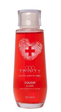 TRINITY haircare essentials colour elixir verzegelt het haar met een anti-fading bescherming die de levendigheid van de kleur beschermt. Granaatappel en rozenbottelextract zorgen voor een brilliante glans en handelbaar, zijdezacht haar, zonder het te verzwaren. Voorkomt kroezen en repareert gespleten haarpunten.